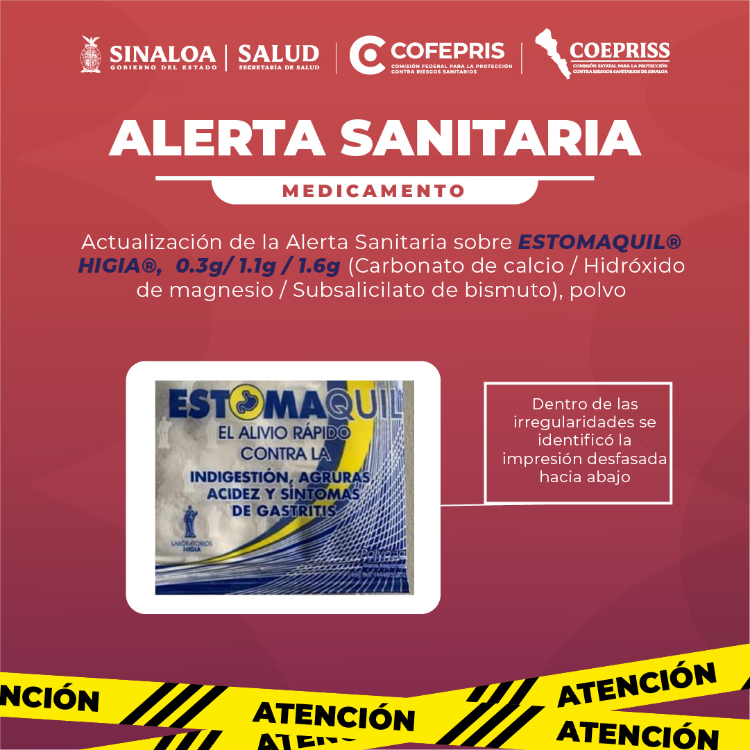 ALERTA SANITARIA MEDICAMENTO Actualización de la Alerta Sanitaria sobre ESTOMAQUIL®HIGIA®, 0.3g/1.1g / 1.6g (Carbonato de calcio / Hidróxido de magnesio / Subsalicilato de bismuto), polvo