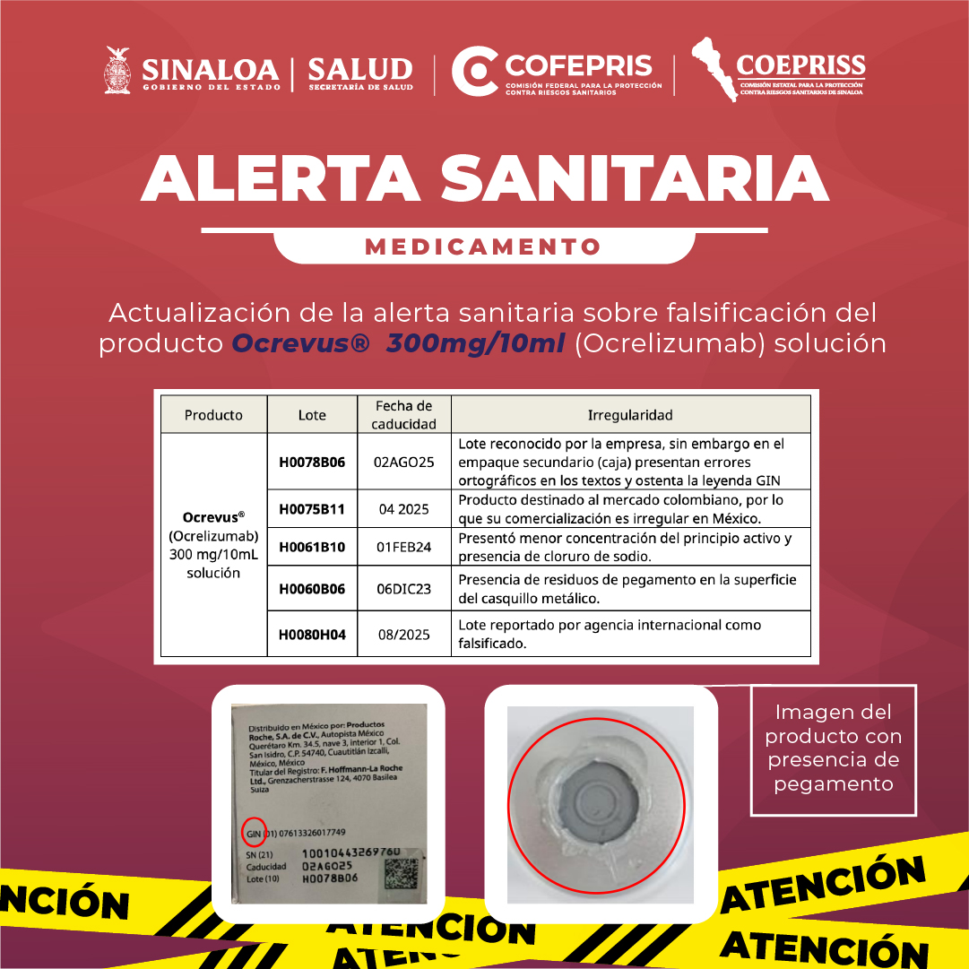 ALERTA SANITARIA MEDICAMENTO Actualización de la alerta sanitaria sobre falsificación del producto Ocrevus®300mg/10ml (Ocrelizumab) solución