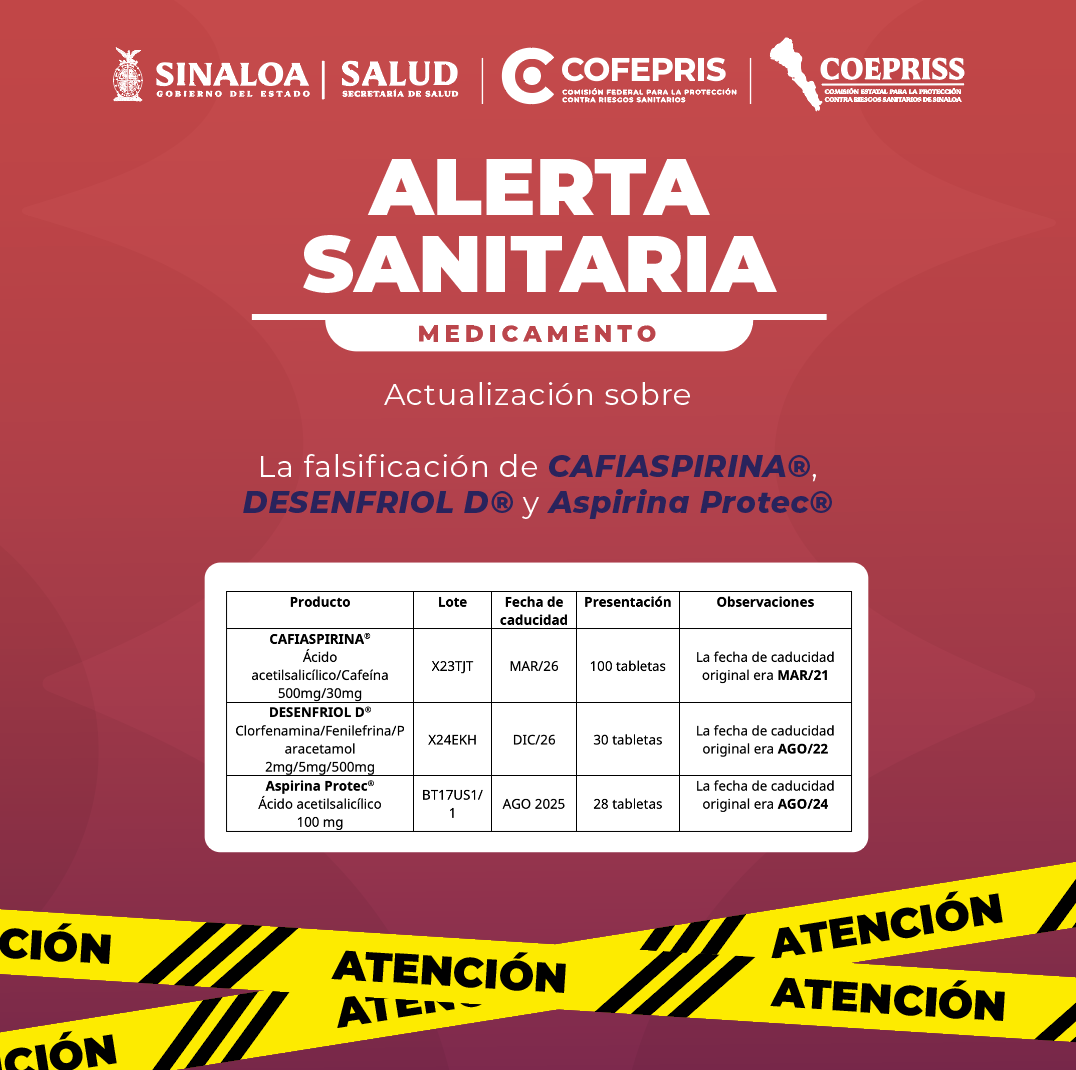 ALERTA SANITARIA MEDICAMENTO Actualización sobre COEPRISS COMISIÓN ESTATAL PARA LA PROTECCIÓNONTRA ETESCOS SANTTARIOS DE SINALOA! La falsificación de CAFIASPIRINA®, DESENFRIOL D® y Aspirina Protec®