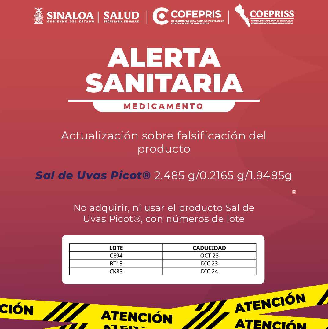 ALERTA SANITARIA MEDICAMENTO Actualización sobre falsificación del producto Sal de Uvas Picot® 2.485 g/0.2165 g/1.9485gPor Editorial / febrero 28, 2025 ALERTA SANITARIA MEDICAMENTO Actualización sobre falsificación del producto Sal de Uvas Picot® 2.485 g/0.2165 g/1.9485g