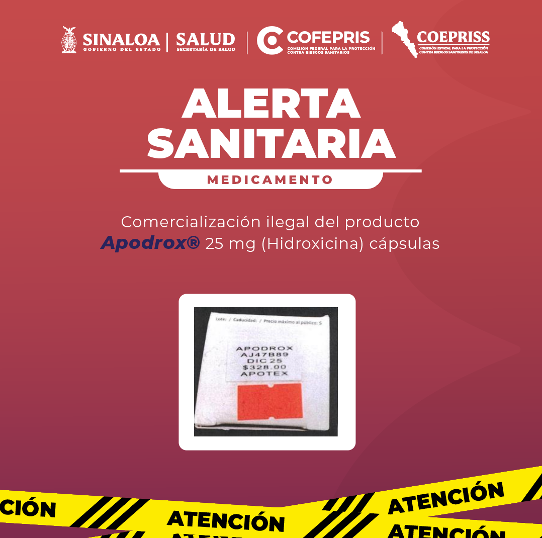 ALERTA SANITARIA MEDICAMENTO Comercialización ilegal del producto Apodrox® 25 mg (Hidroxicina) cápsulasPor Editorial / febrero 28, 2025 ALERTA SANITARIA MEDICAMENTO Comercialización ilegal del producto Apodrox® 25 mg (Hidroxicina) cápsulas