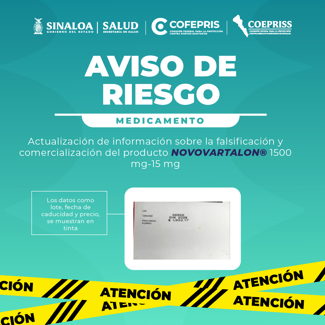AVISO DE RIESGO MEDICAMENTO Actualización de información sobre la falsificación y comercialización del producto NOVOVARTALON® 1500mg-15 mg