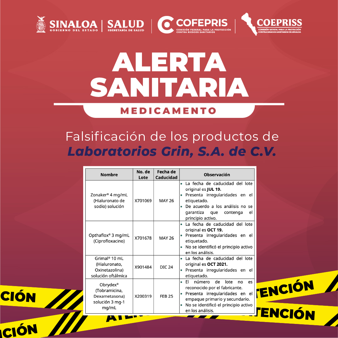 ALERTA SANITARIA MEDICAMENTO Falsificación de los productos de Laboratorios Grin, S.A. de C.V.Por Editorial / abril 15, 2025 ALERTA SANITARIA MEDICAMENTO Falsificación de los productos de Laboratorios Grin, S.A. de C.V.
