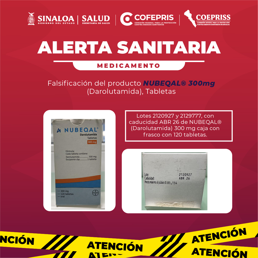ALERTA SANITARIA MEDICAMENTO Falsificación del producto NUBEQAL® 300mg (Darolutamida), TabletasPor Editorial / junio 17, 2025 ALERTA SANITARIA MEDICAMENTO Falsificación del producto NUBEQAL® 300mg (Darolutamida), Tabletas