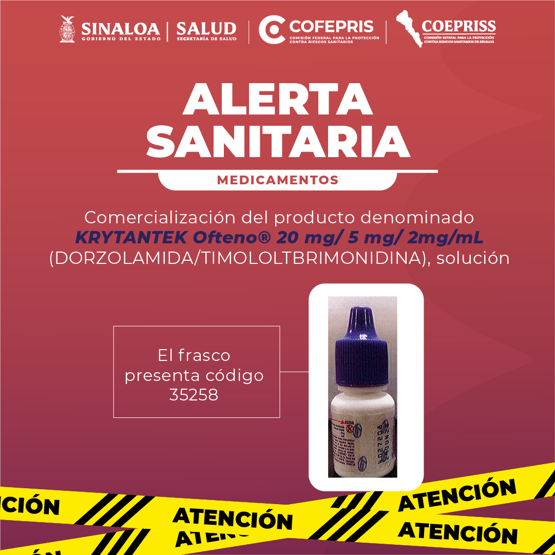 ALERTA SANITARIA MEDICAMENTOS Comercialización del producto denominado KRYTANTEK Ofteno® 20 mg/ 5 mg/ 2 mg /mL(DORZOLAMIDA/TIMOLOLTBRIMONIDINA), solución
