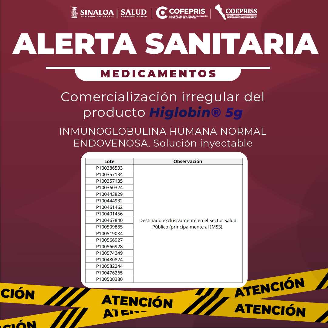 ALERTA SANITARIA MEDICAMENTOS Comercialización irregular del producto Higlobin® 5g INMUNOGLOBULINA HUMANA NORMALENDOVENOSA, Solución inyectable