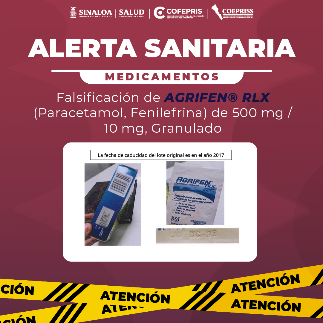 ALERTA SANITARIA MEDICAMENTOS Falsificación de AGRIFEN® RLX (Paracetamol, Fenilefrina) de 500 mg / 10 mg, GranuladoPor Editorial / julio 17, 2025 ALERTA SANITARIA MEDICAMENTOS Falsificación de AGRIFEN® RLX (Paracetamol, Fenilefrina) de 500 mg / 10 mg, Granulado