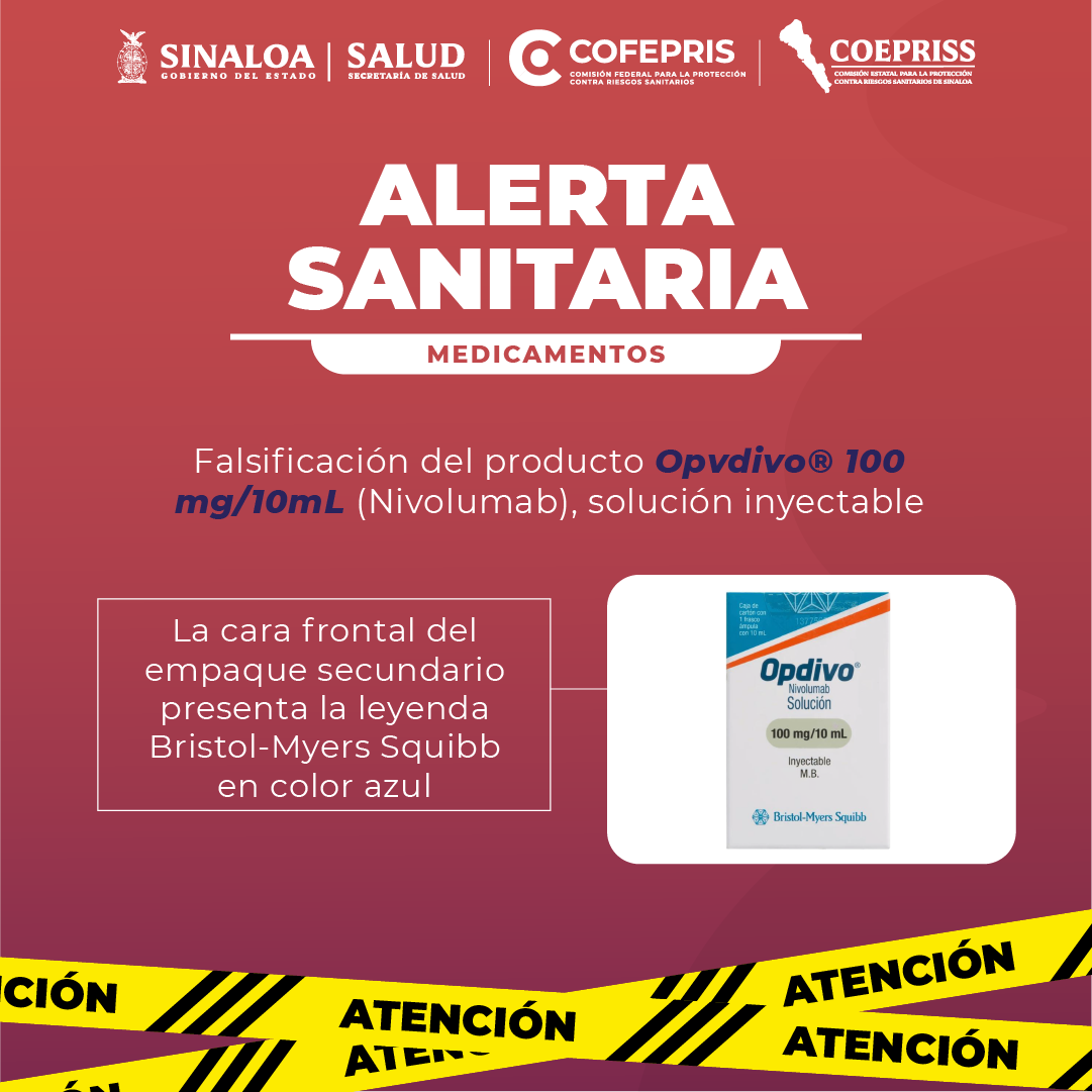 ALERTA SANITARIA MEDICAMENTOS Falsificación del producto Opvdivo® 100 mg/10mL (Nivolumab), solución inyectablePor Editorial / junio 30, 2025 ALERTA SANITARIA MEDICAMENTOS Falsificación del producto Opvdivo® 100 mg/10mL (Nivolumab), solución inyectable