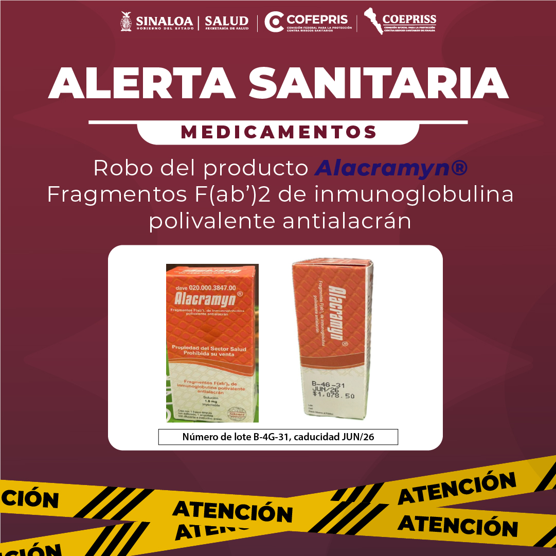ALERTA SANITARIA MEDICAMENTOS Robo del producto Alacramyn® Fragmentos F(ab’)2 de inmunoglobulina polivalente antialacránPor Editorial / agosto 19, 2025 ALERTA SANITARIA MEDICAMENTOS Robo del producto Alacramyn® Fragmentos F(ab’)2 de inmunoglobulina polivalente antialacrán
