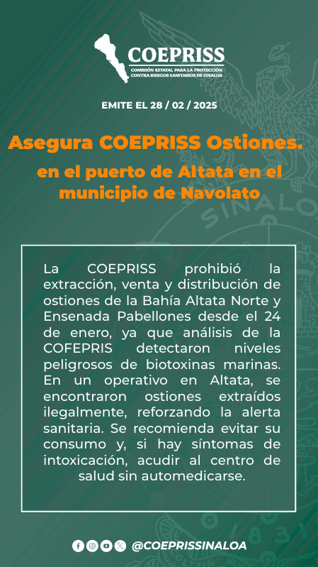 Asegura COEPRISS Ostiones: en el puerto de Altata en el municipio de Navolato.