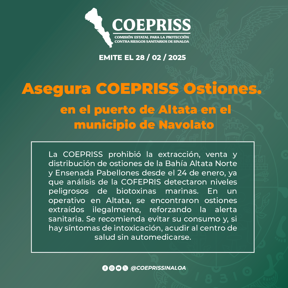 Asegura COEPRISS Ostiones en el puerto de Altata en el municipio de NavolatoPor Editorial / febrero 28, 2025 Asegura COEPRISS Ostiones en el puerto de Altata en el municipio de Navolato