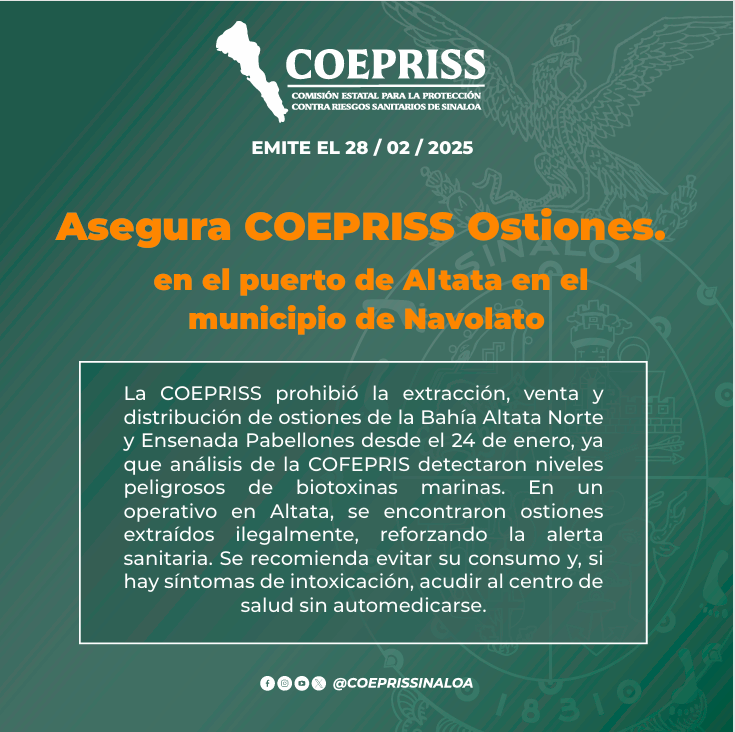 Asegura COEPRISS Ostiones en el puerto de Altata en el municipio de NavolatoPor Editorial / febrero 28, 2025 Asegura COEPRISS Ostiones en el puerto de Altata en el municipio de Navolato
