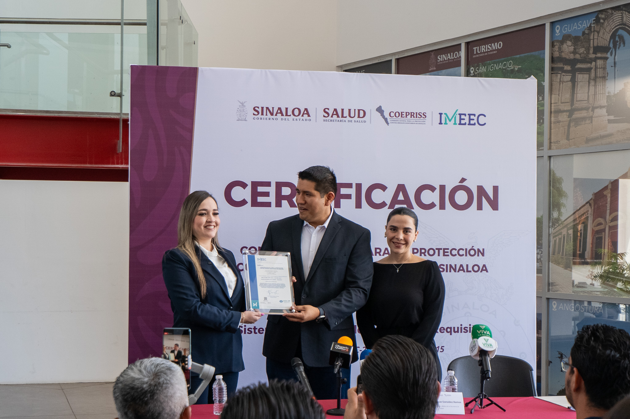 El Instituto Mexicano de Normalización y Certificación, A.C. (IMEEC), hizo entrega oficial de un certificado a la Comisión Estatal para la Protección contra Riesgos Sanitarios de Sinaloa (COEPRISS), en reconocimiento al cumplimiento de estándares de calidad y mejora continua en sus procesos.