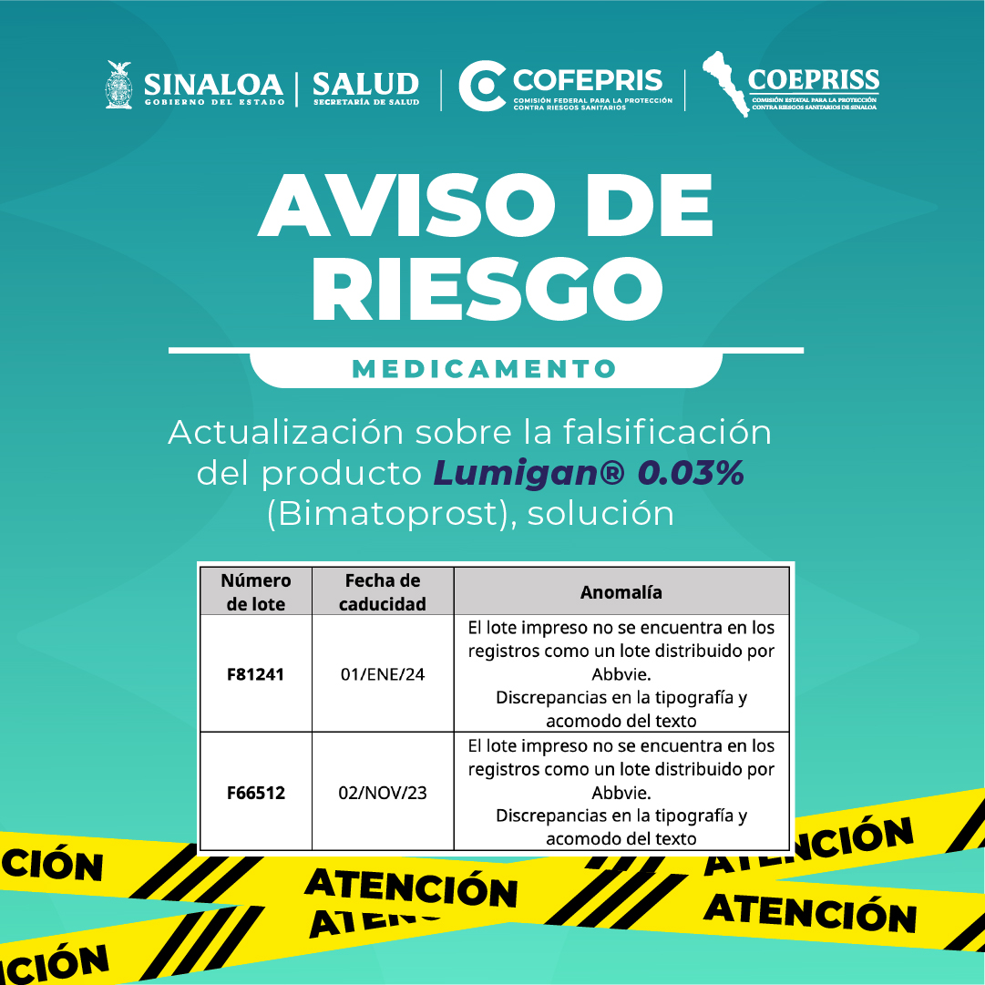 AVISO DE RIESGO MEDICAMENTO Actualización sobre la falsificación del producto Lumigan® 0.03%(Bimatoprost), soluciónPor Editorial / abril 15, 2025 AVISO DE RIESGO MEDICAMENTO Actualización sobre la falsificación del producto Lumigan® 0.03%(Bimatoprost), solución