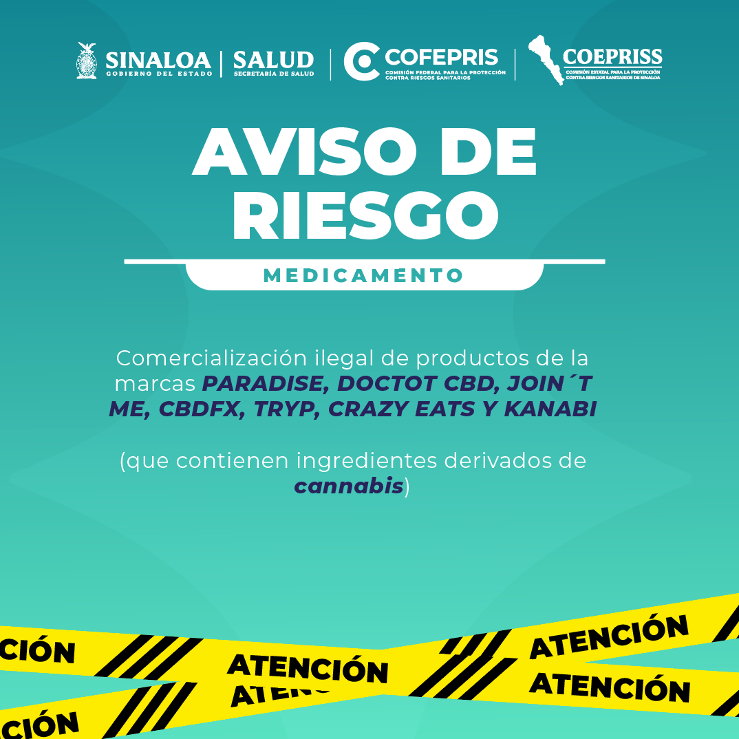 AVISO DE RIESGO MEDICAMENTO COEPRISS COMISIÓN ESTATAL PARA LA PROTECCIÓN CONTRA INES COS SANTLAILOS DE SINALOA Comercialización ilegal de productos de la marcas PARADISE, DOCTOT CBD, JOIN ‘T ME, CBDFX, TRYP, CRAZY EATS Y KANABI