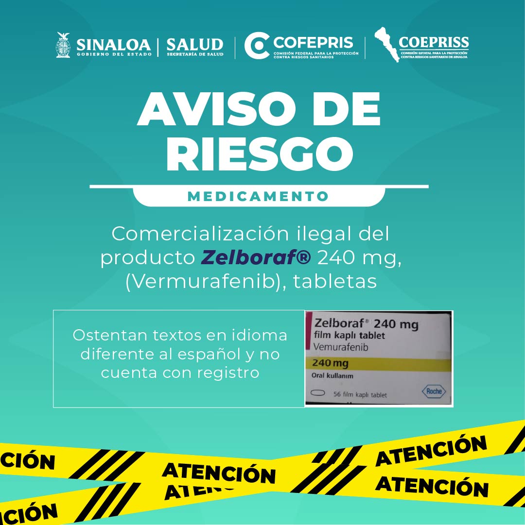 AVISO DE RIESGO MEDICAMENTO Comercialización ilegal del producto Zelboraf® 240 mg,(Vermurafenib), tabletasPor Editorial / marzo 20, 2025 AVISO DE RIESGO MEDICAMENTO Comercialización ilegal del producto Zelboraf® 240 mg,(Vermurafenib), tabletas