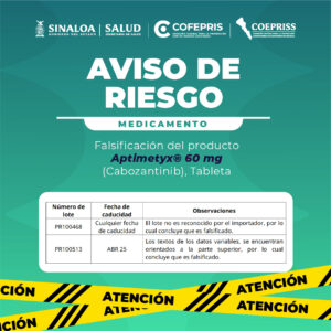 AVISO DE RIESGO MEDICAMENTO Falsificación del producto Aptimetyx® 60 mg (Cabozantinib), Tableta