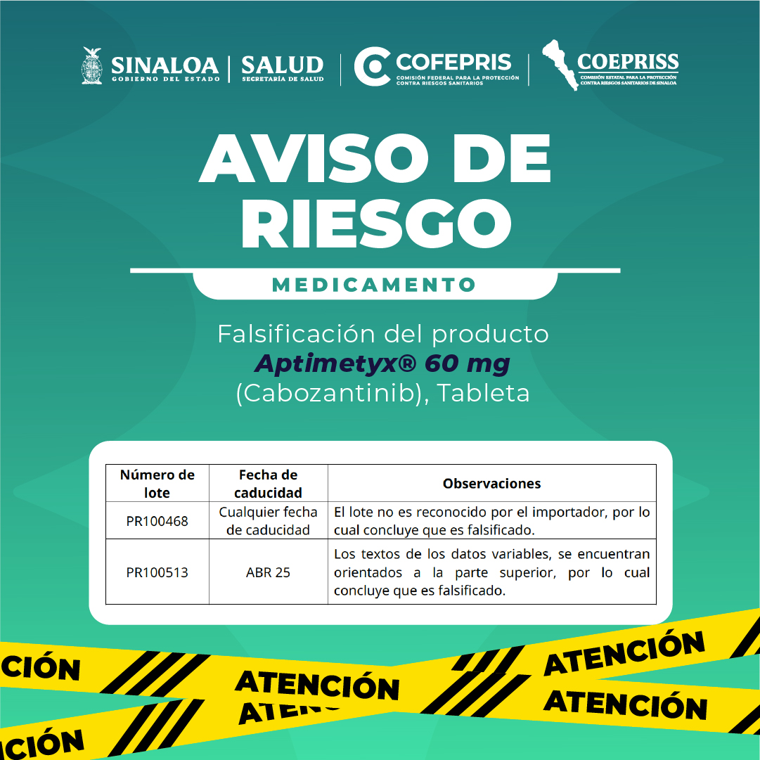 AVISO DE RIESGO MEDICAMENTO Falsificación del producto Aptimetyx® 60 mg (Cabozantinib), TabletaPor Editorial / junio 30, 2025 AVISO DE RIESGO MEDICAMENTO Falsificación del producto Aptimetyx® 60 mg (Cabozantinib), Tableta