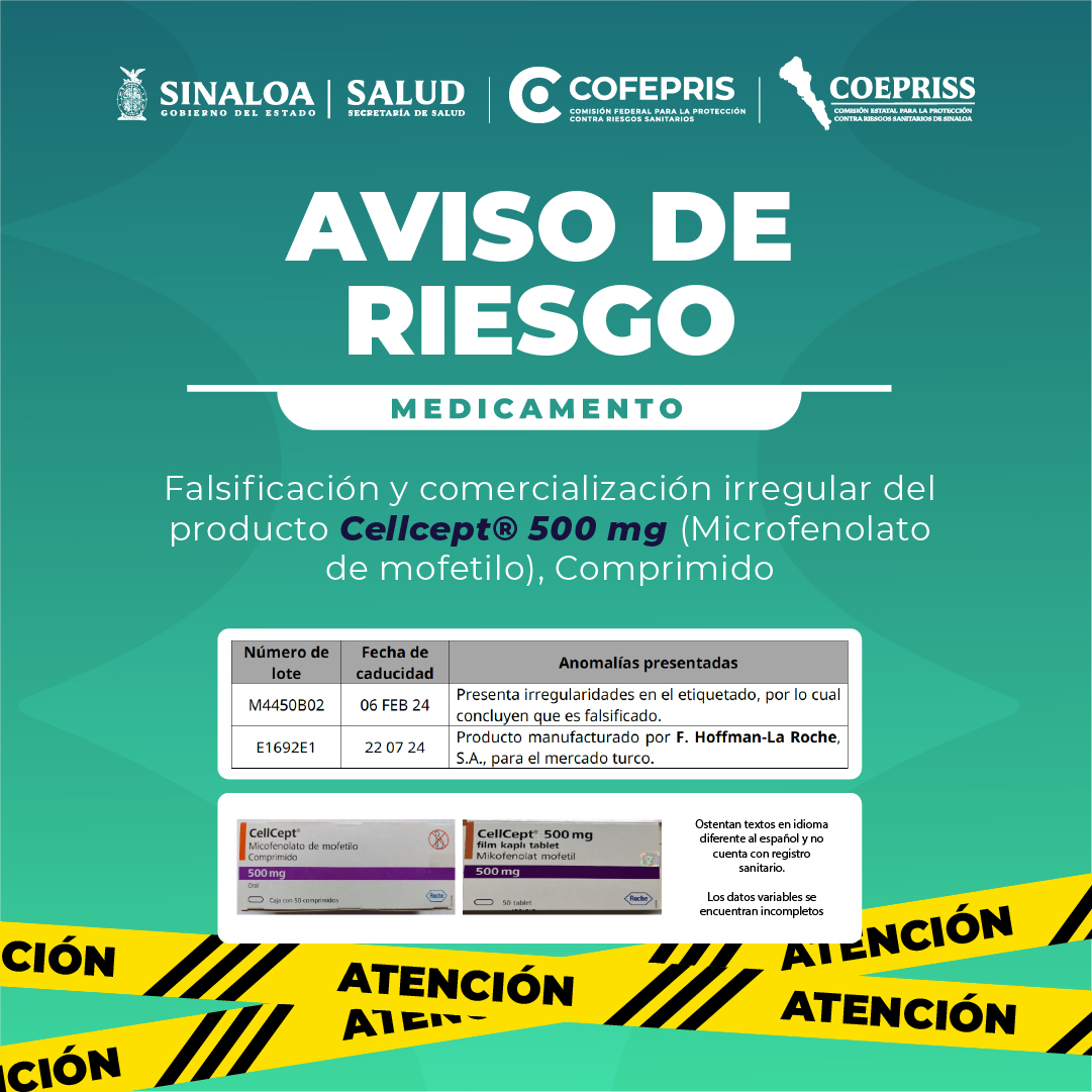 AVISO DE RIESGO MEDICAMENTO Falsificación y comercialización irregular del producto Cellcept® 500 mg (Microfenolato de mofetilo), Comprimido