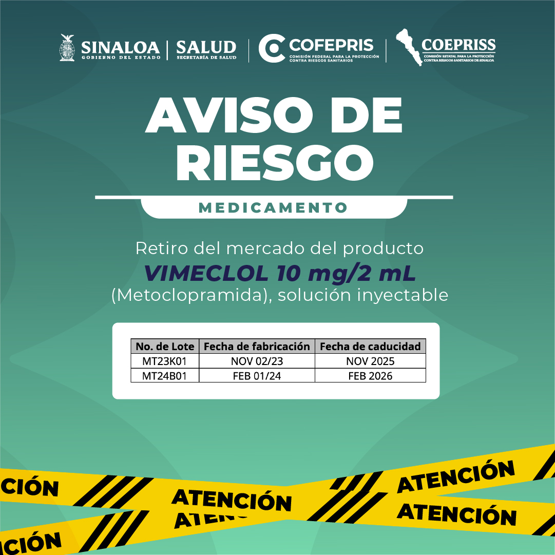AVISO DE RIESGO MEDICAMENTO Retiro del mercado del producto VIMECLOL 10 mg/2 mL (Metoclopramida), solución inyectable