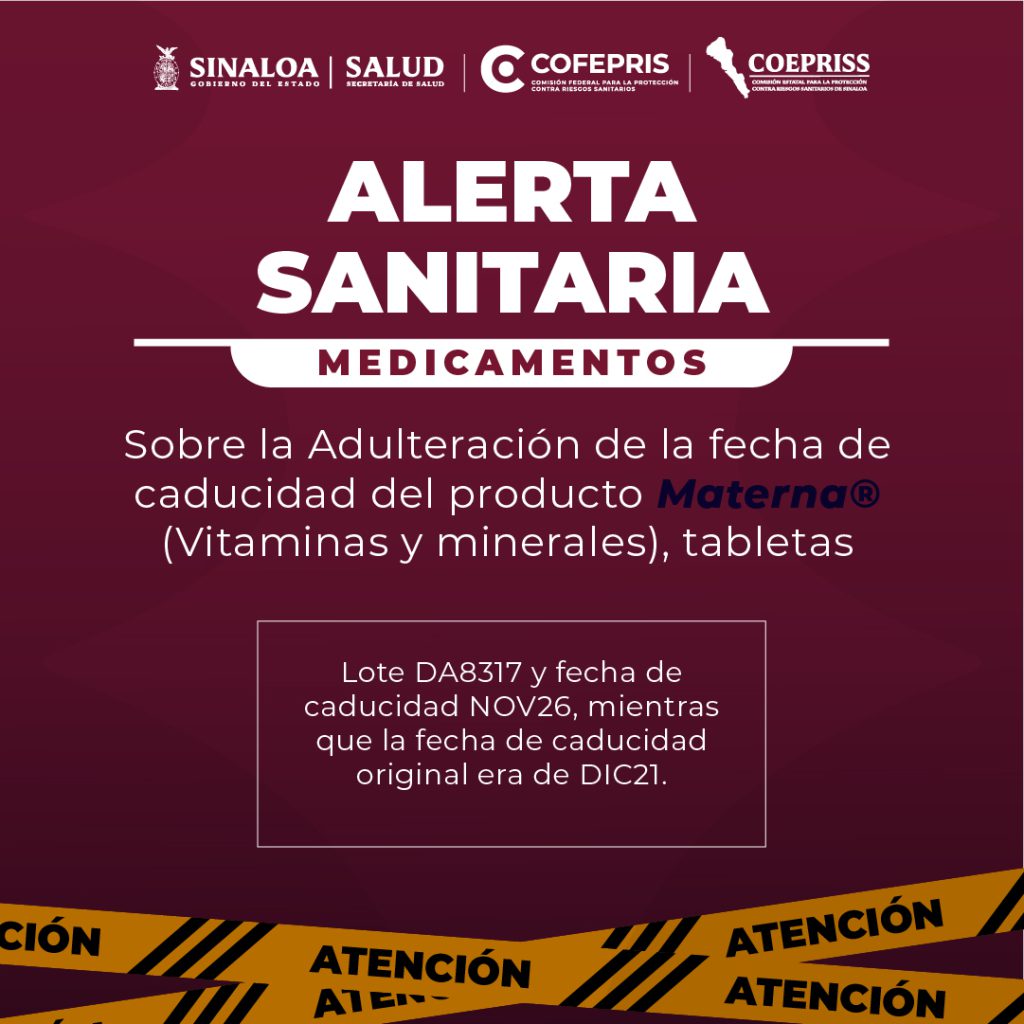 Alerta Sanitaria – Materna® COFEPRIS informa que el producto Materna® (Vitaminas y Minerales), lote DA8317, frasco con 30 tabletas, presenta