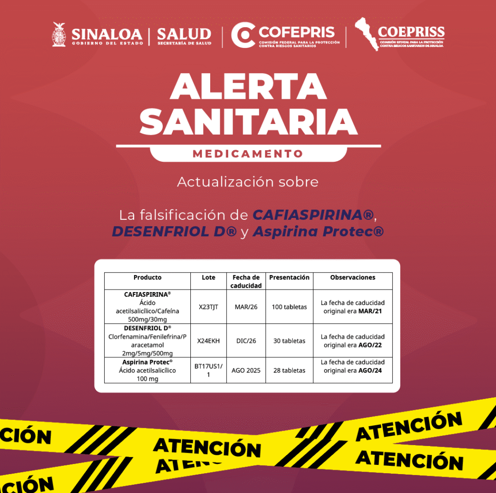 ALERTA SANITARIA MEDICAMENTO Actualización sobre COEPRISS COMISIÓN ESTATAL PARA LA PROTECCIÓNONTRA ETESCOS SANTTARIOS DE SINALOA! La falsificación de CAFIASPIRINA®, DESENFRIOL