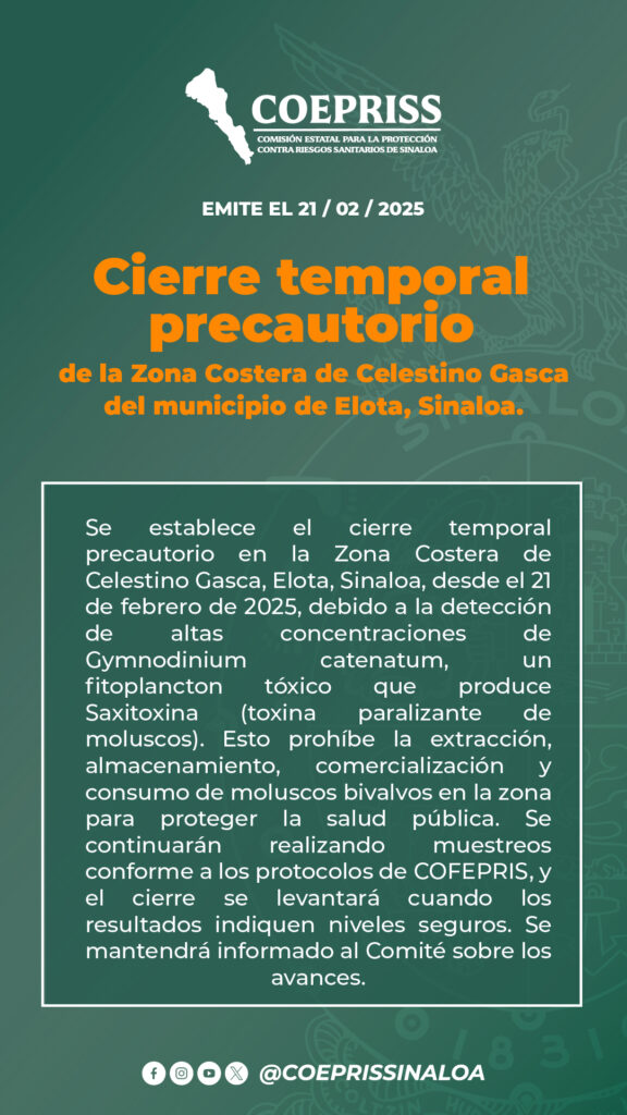 Cierre temporal precautorio de la Zona Costera de Celestino Gasca del municipio de Elota, Sinaloa.
