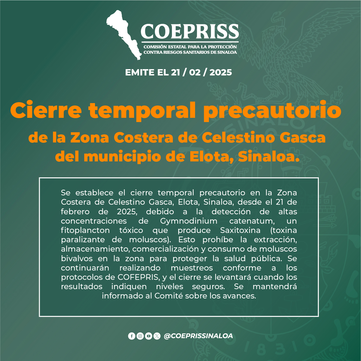Cierre temporal precautorio de la Zona Costera de Celestino Gasca del municipio de Elota, Sinaloa.Por Editorial / febrero 28, 2025 Cierre temporal precautorio de la Zona Costera de Celestino Gasca del municipio de Elota, Sinaloa.