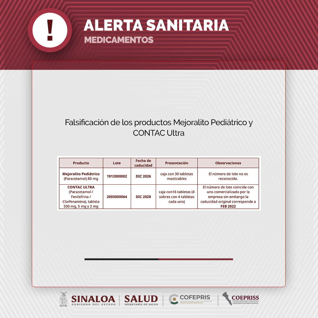 La Comisión Federal para la Protección contra Riesgos Sanitarios (COFEPRIS) informa sobre la falsificación de los productos Mejoralito Pediátrico y CONTAC ULTRA, cuyo titular de los registros sanitarios es HALEON CONSUMER HEALTHCARE S. DE R.L. DE C.V., quien indicó que los números de lote que se describen a continuación fueron falsificados.