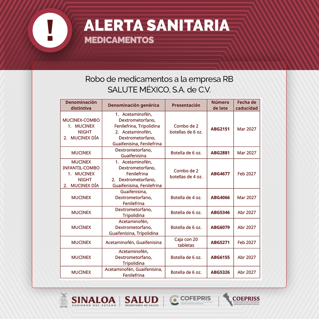 La Comisión Federal para la Protección contra Riesgos Sanitarios (COFEPRIS) informa sobre el robo, ocurrido durante el traslado a Nuevo Laredo, Tamaulipas, de los medicamentos MUCINEX-COMBO, MUCINEX y MUCINEX INFANTIL-COMBO, el cual fue notificado por la empresa RB SALUTE MÉXICO, S.A. de C.V.