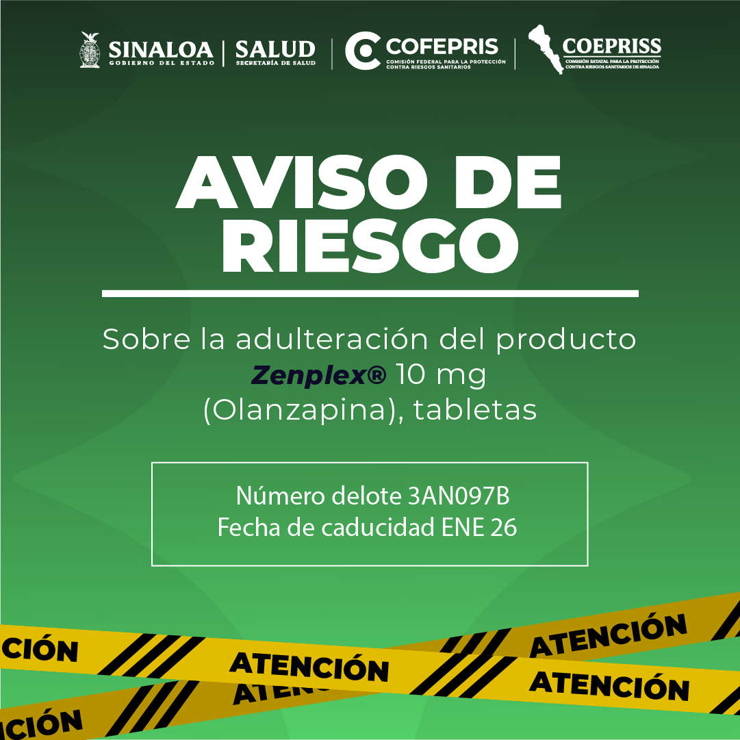 La Comisión Federal para la Protección contra Riesgos Sanitarios (COFEPRIS) informa que la fecha de caducidad del producto Zenplex® (Olanzapina), en presentación de tabletas de 10 mg y con número de lote 3AN097B, fue adulterada.